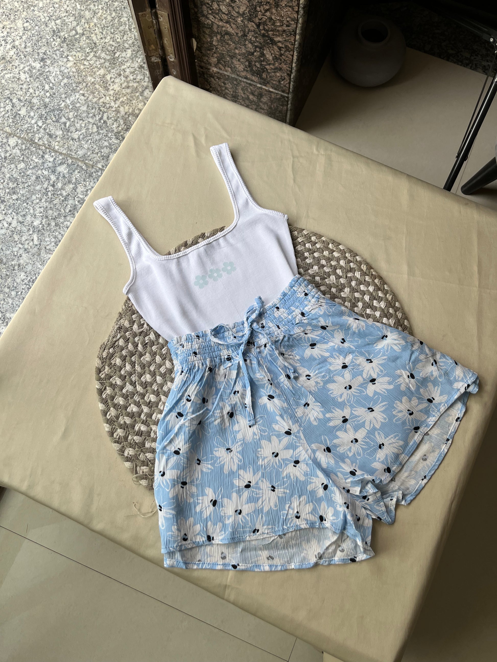 Blue with white flowers, front knot detail, stretchable waist. Made from breathable cotton, perfect for summer.
