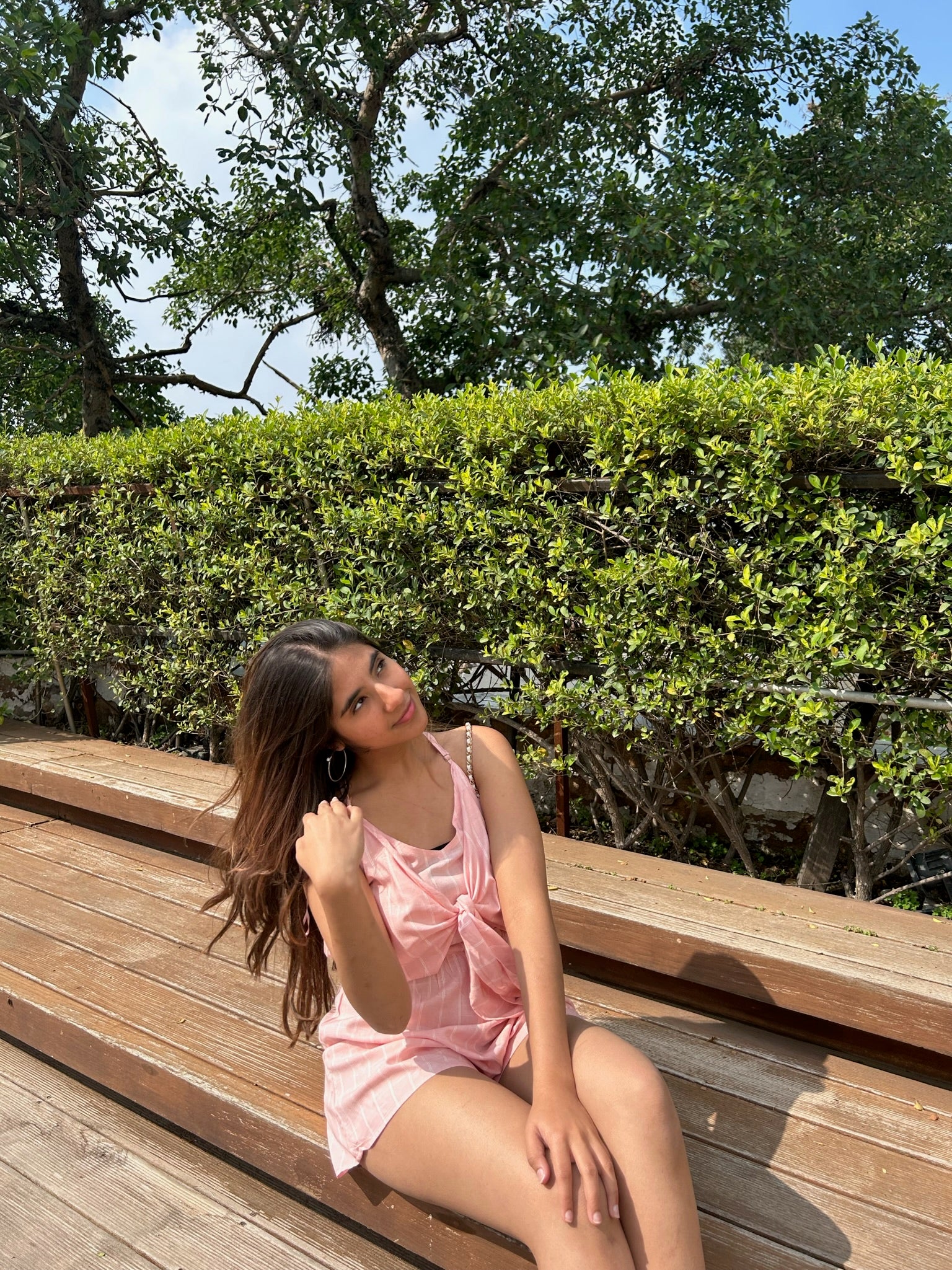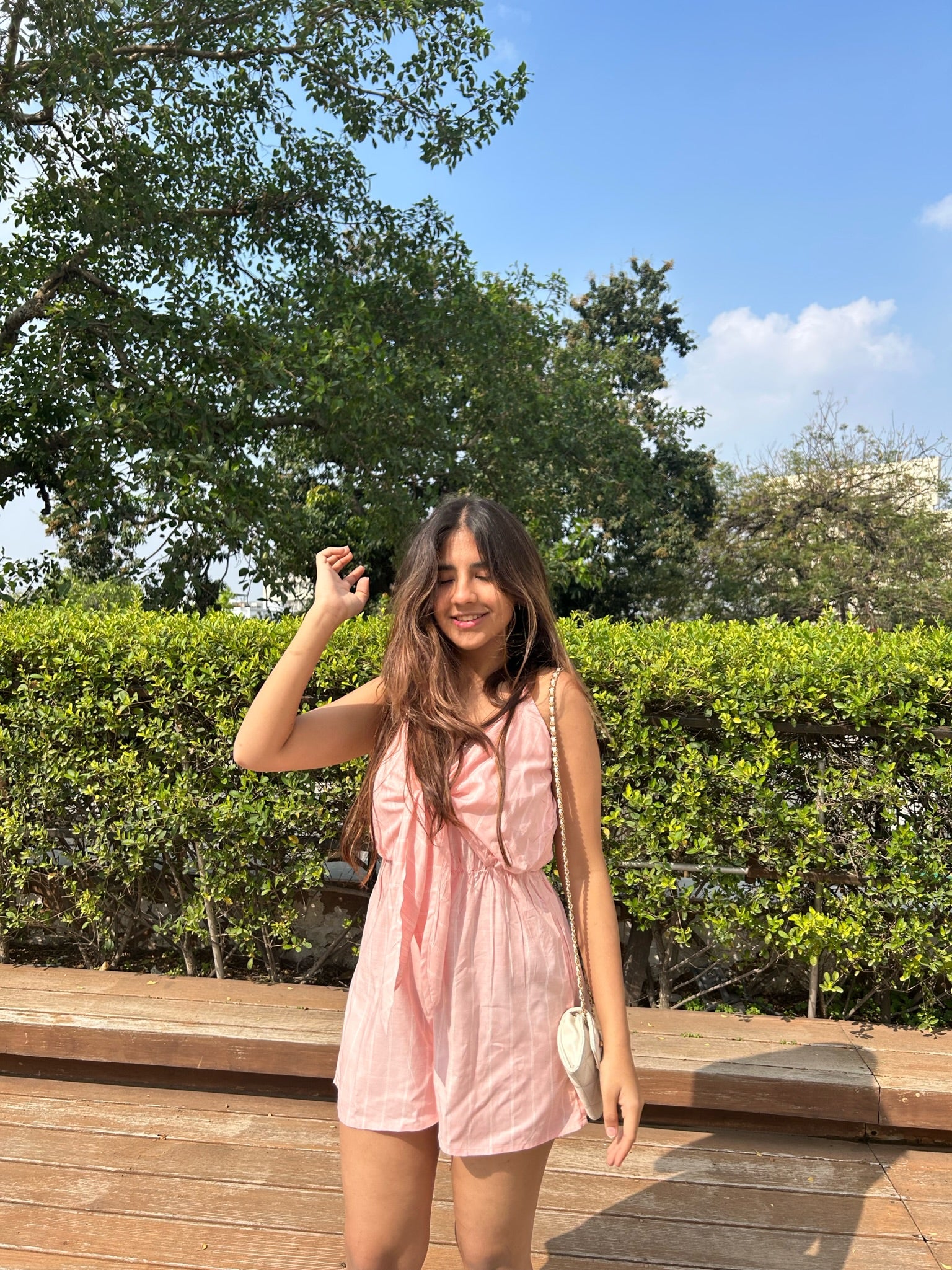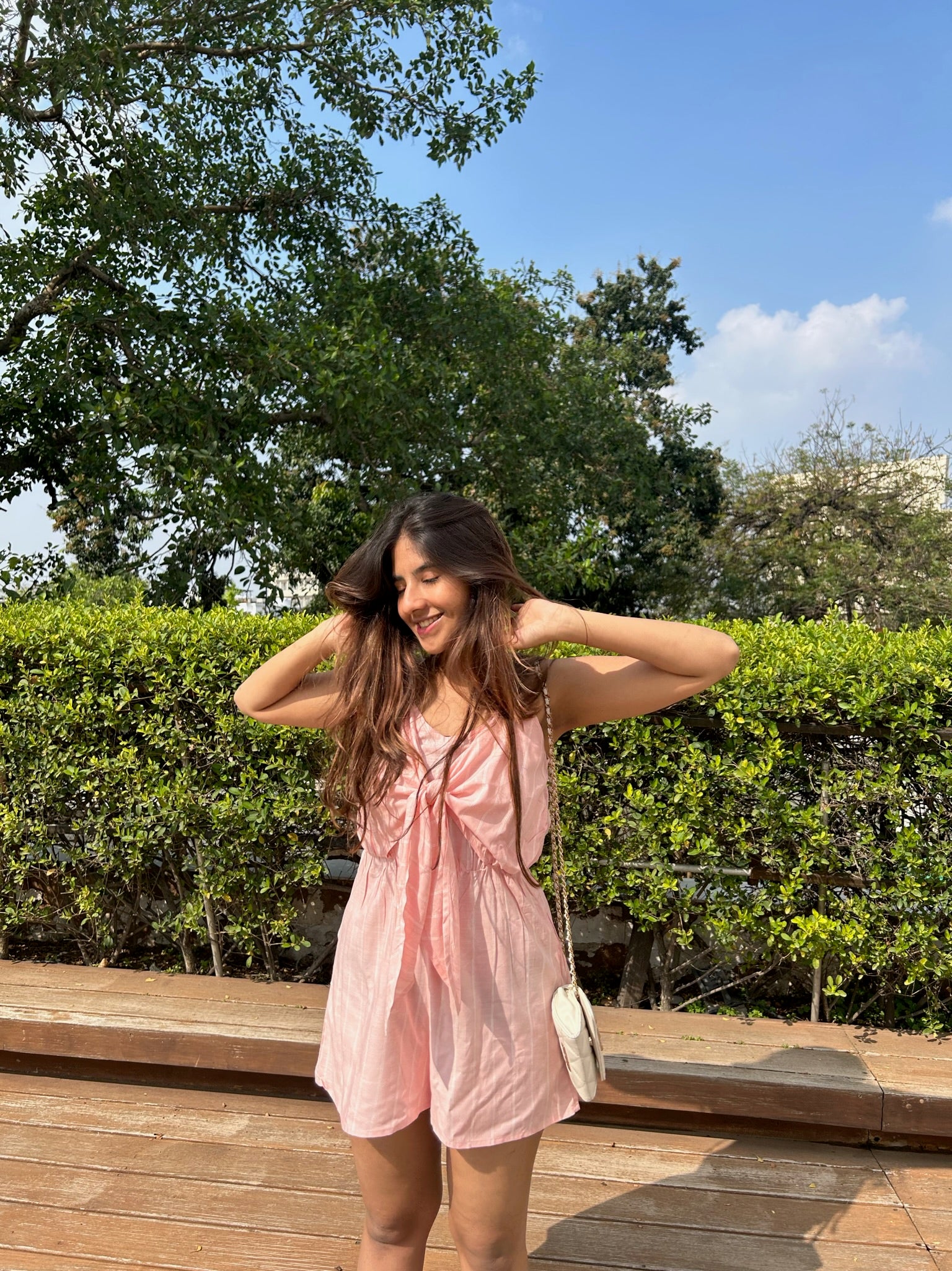 Lightweight peachy pink fabric with white vertical lines, this romper features a flattering bow detail at the front, adjustable straps, and a stretchable waist.