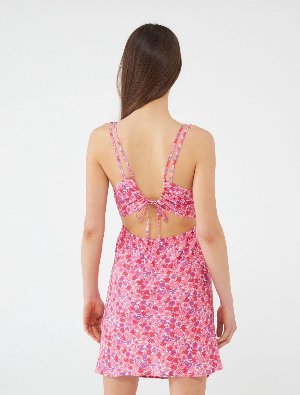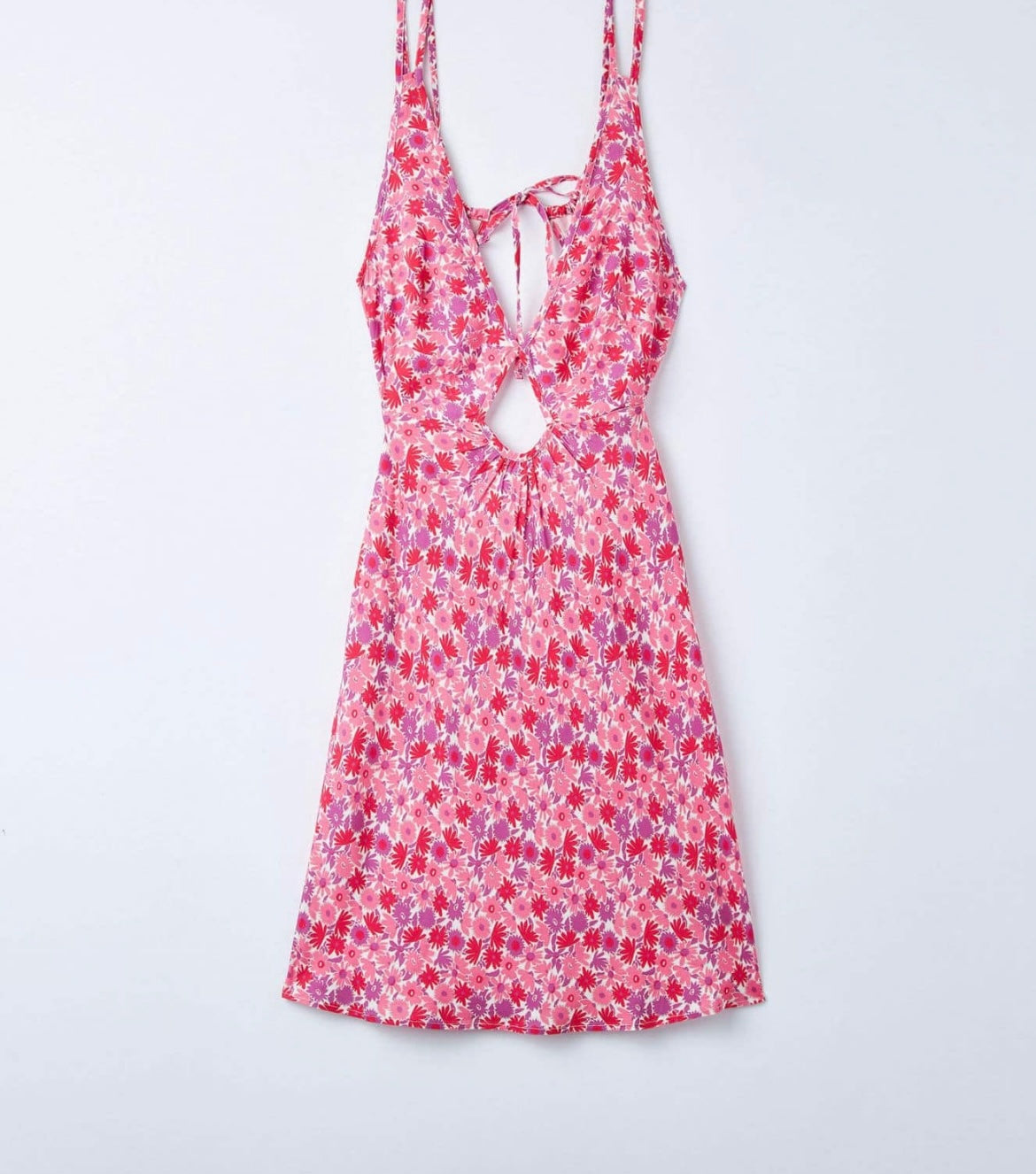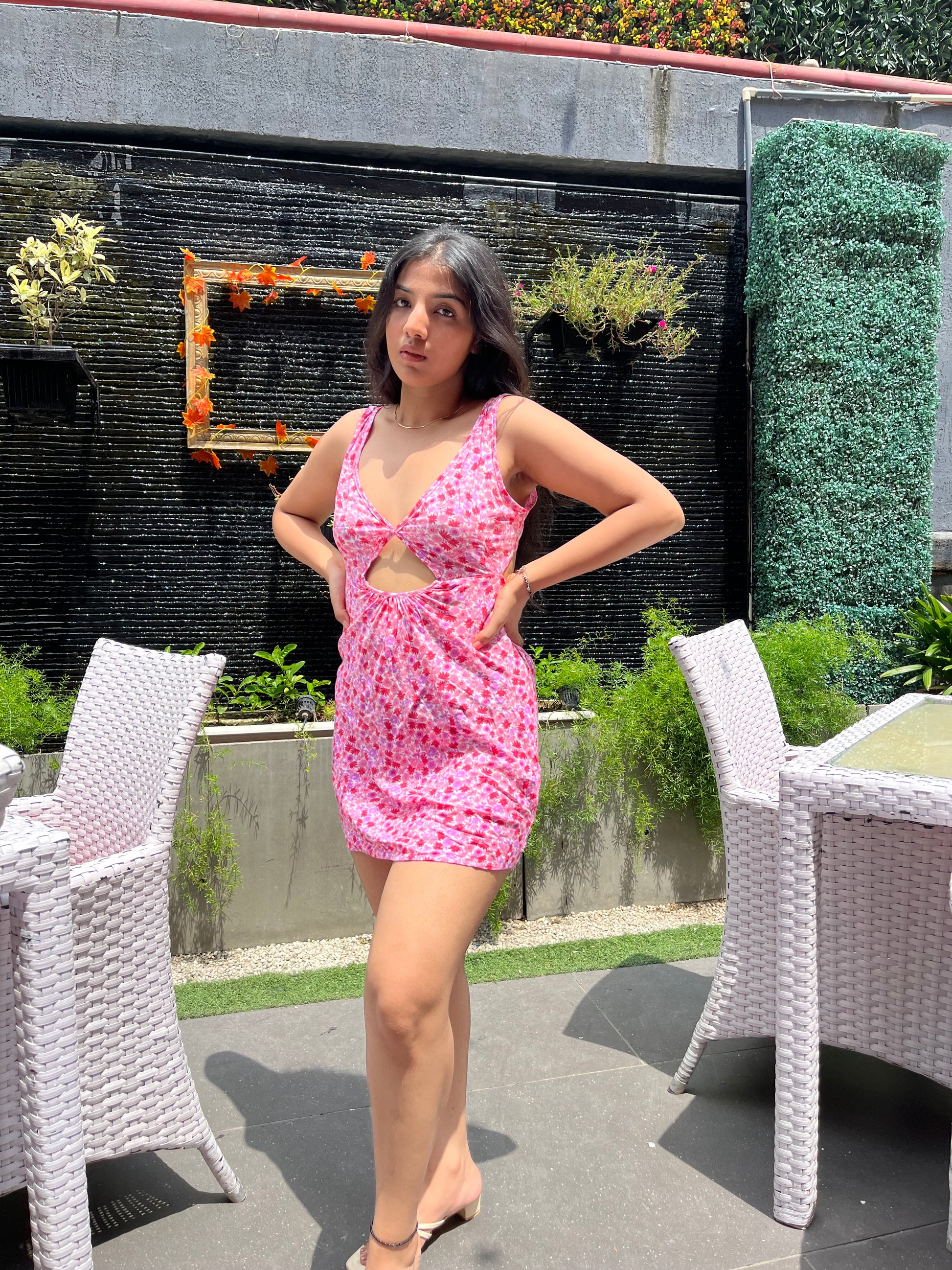 A short pink floral cut out dress with a V neckline and string at the back. Delicate to your skin, made of super comfortable fabric. The perfect backless dress for summers.