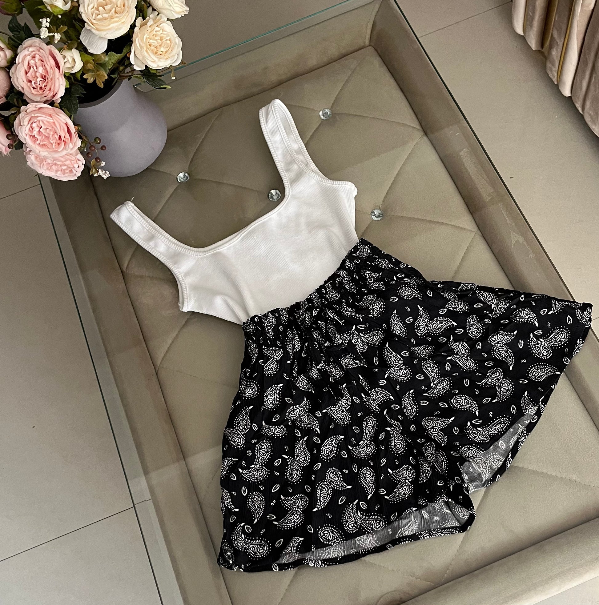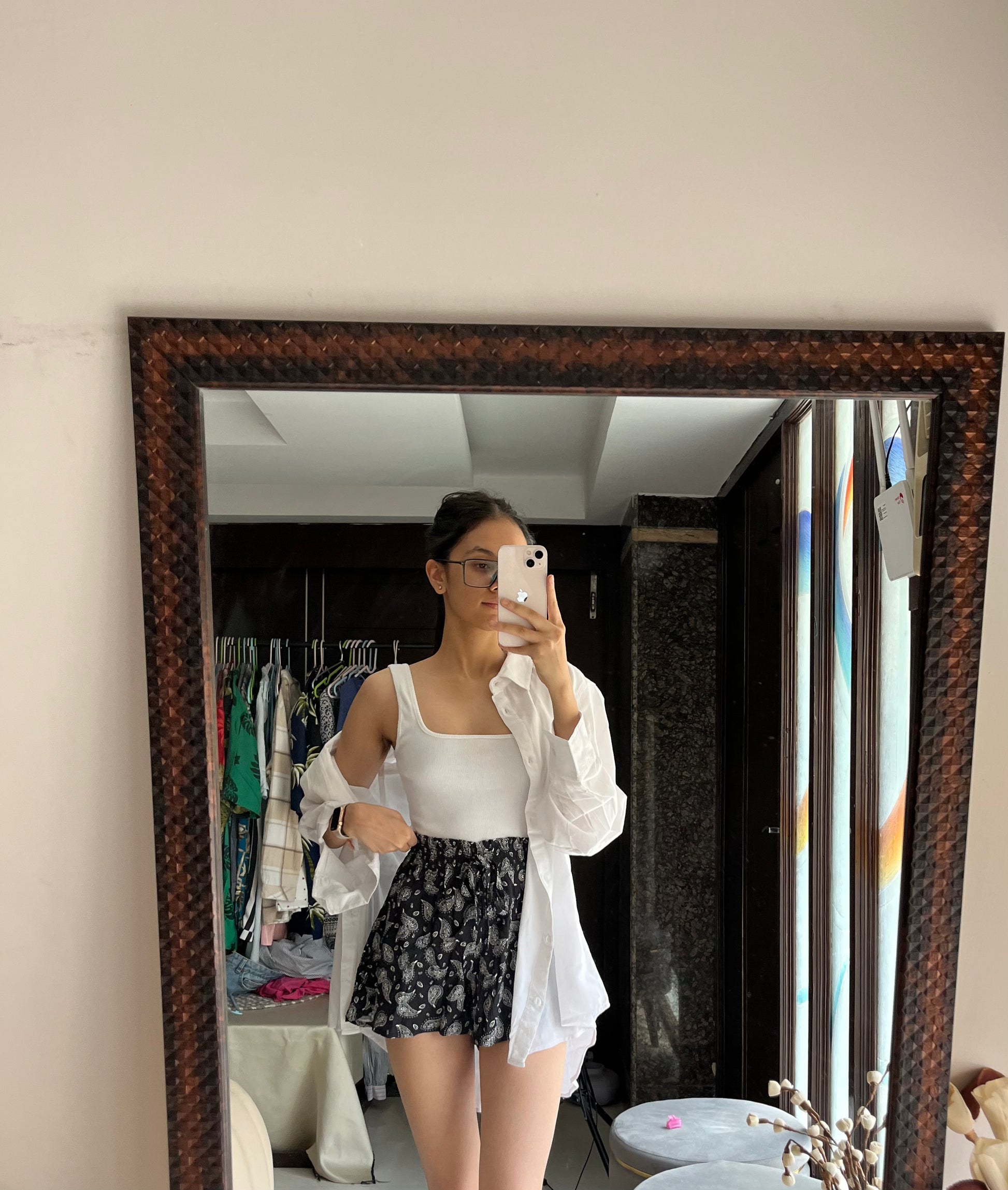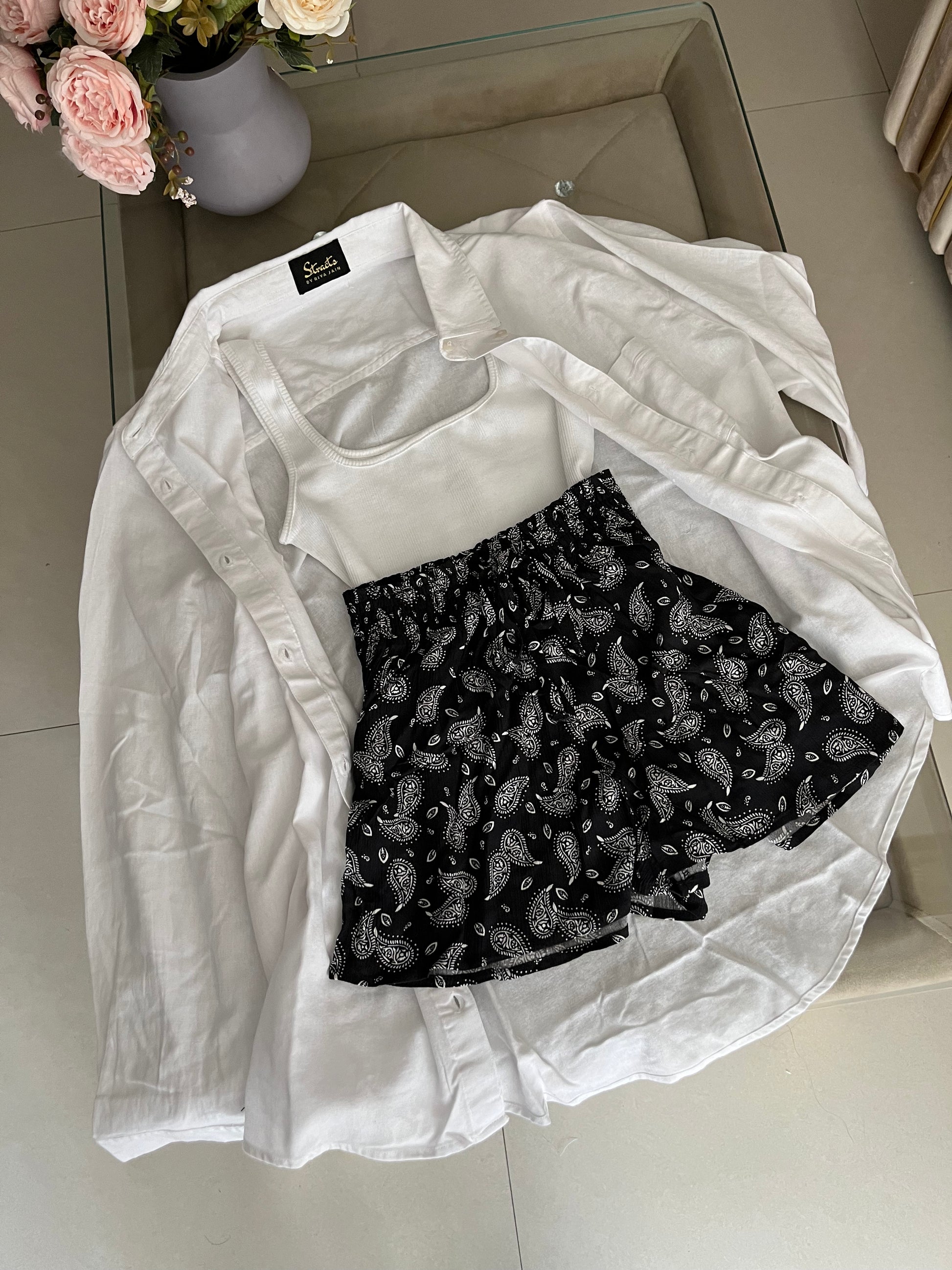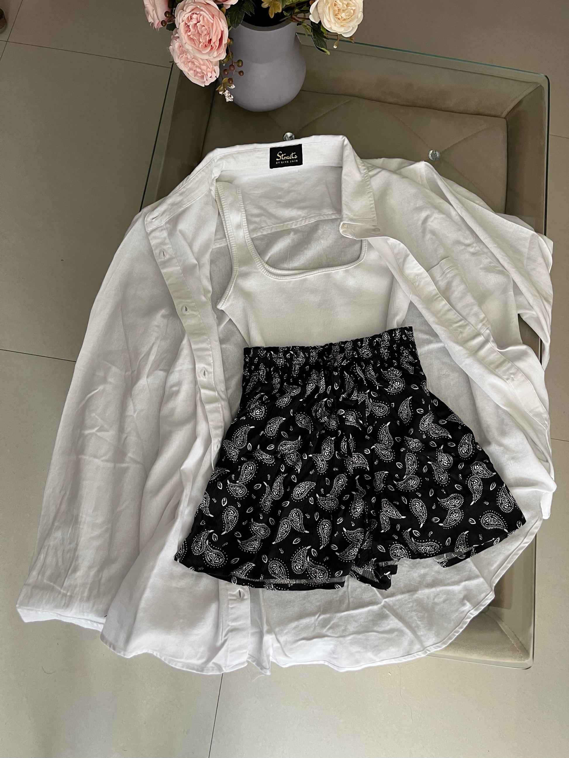 Blue with white flowers, front knot detail, stretchable waist. Made from breathable cotton, perfect for summer.