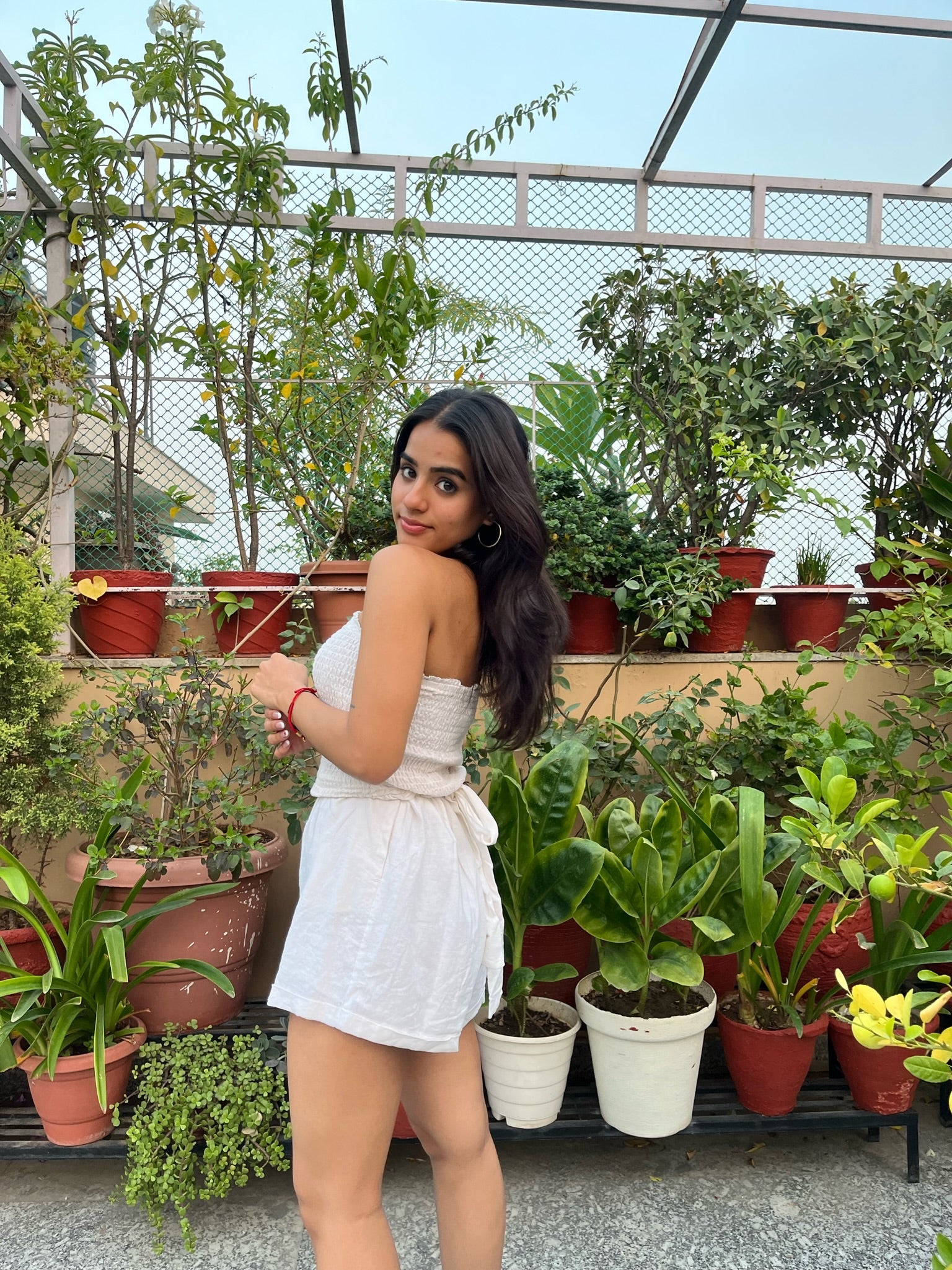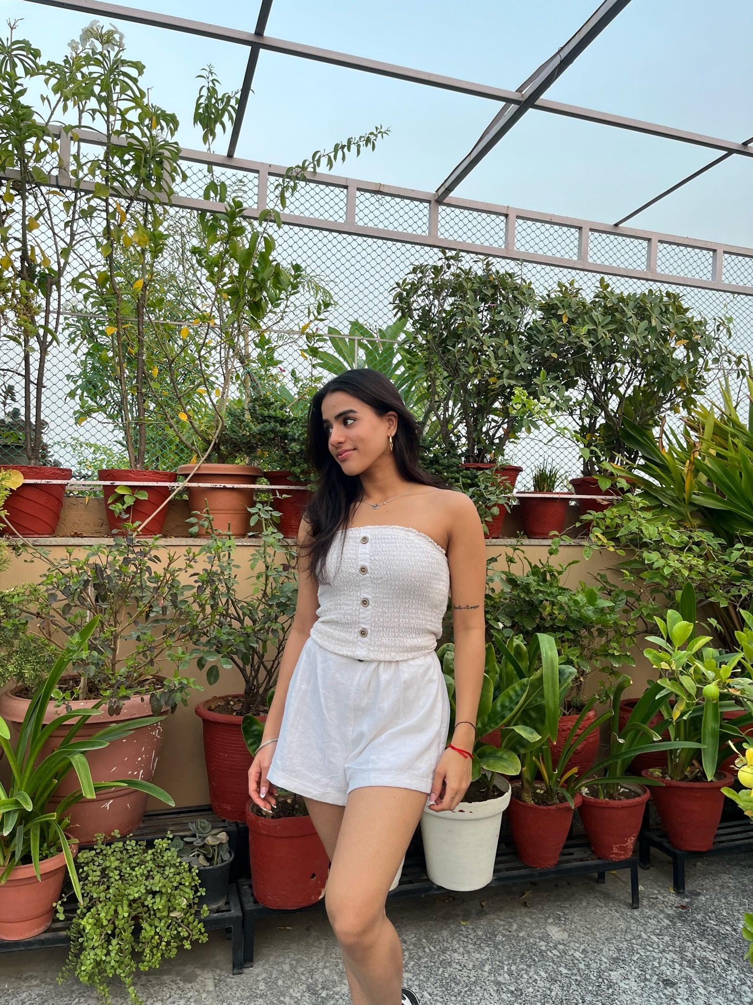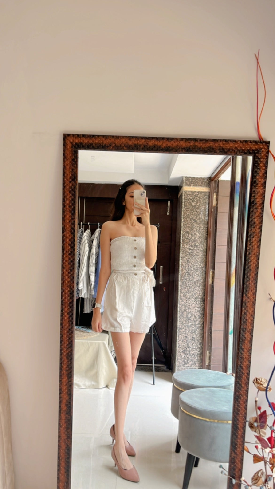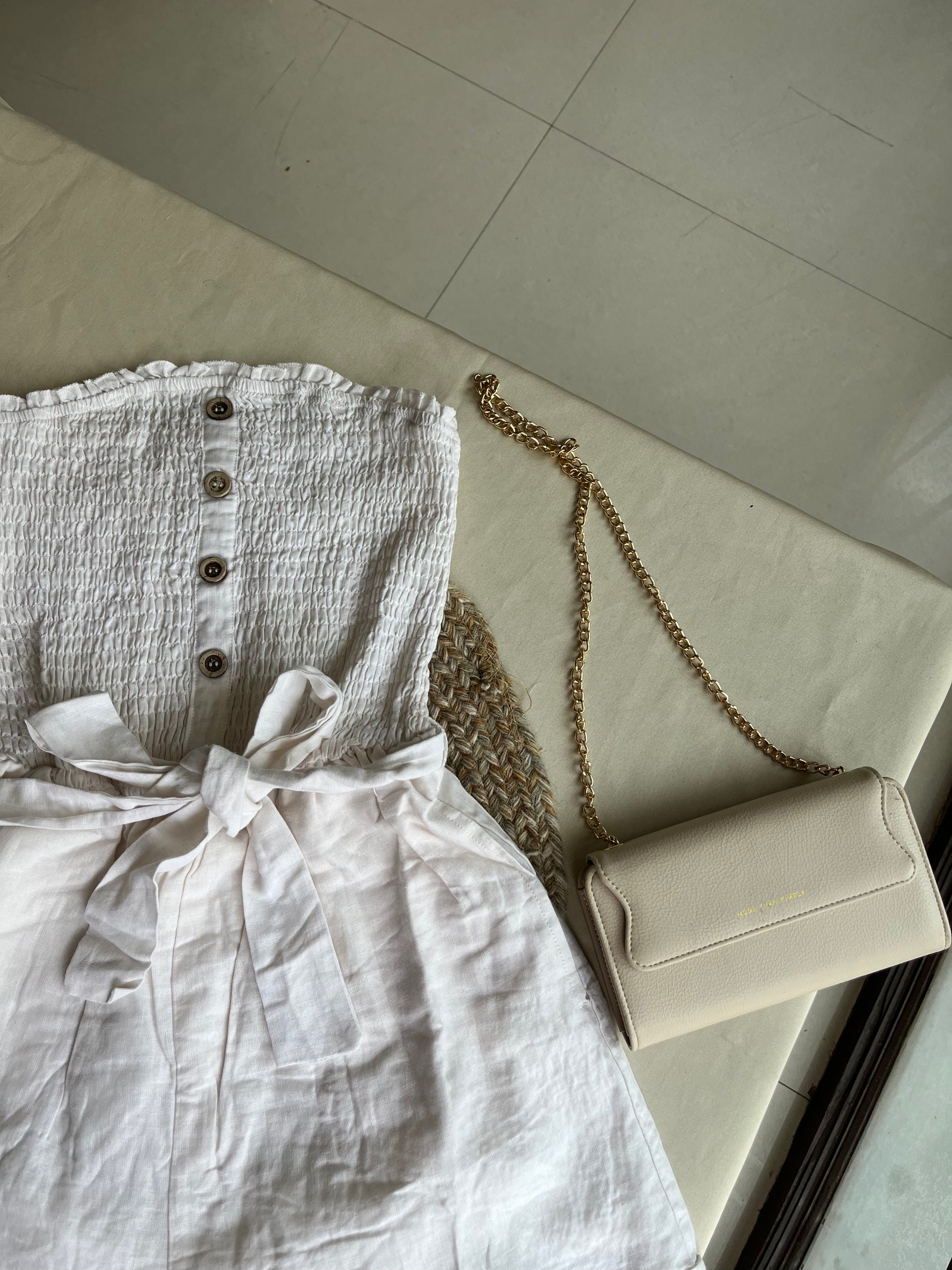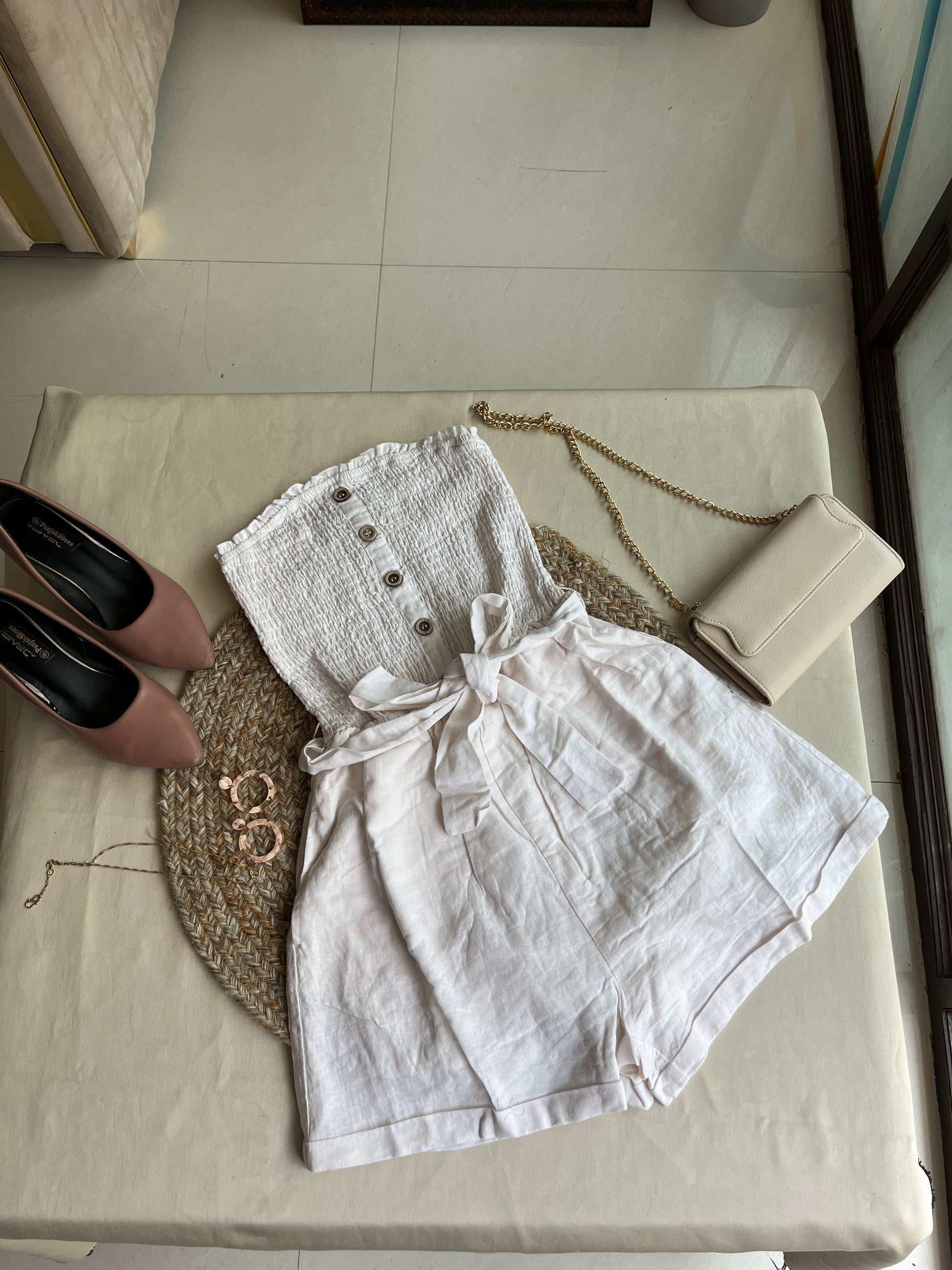 A lightweight fabric, complete with front buttons for added flair, a tie waist, and a chic no-shoulder design, it's versatile and chic!